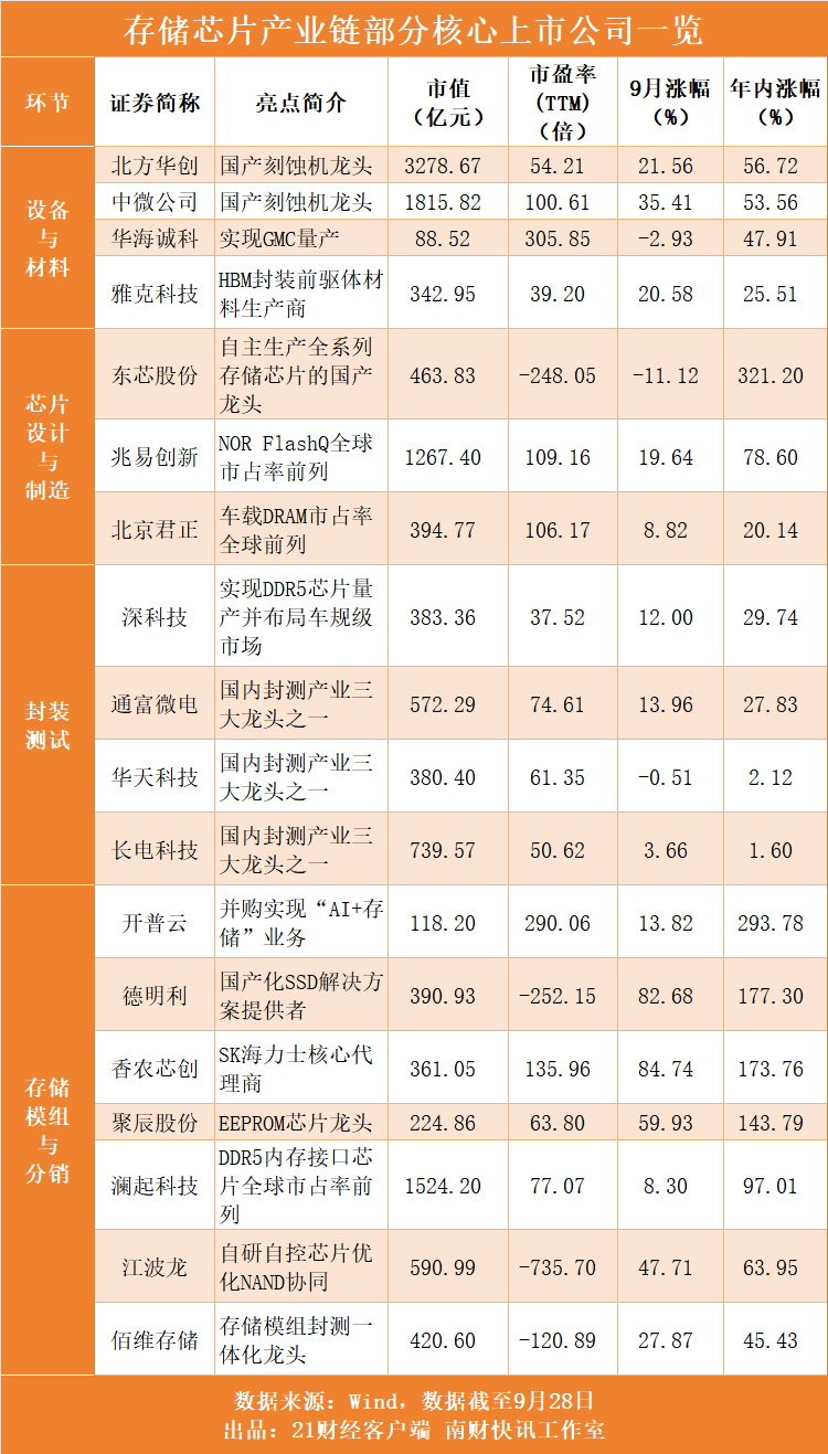 21财经·南财快讯记者梳理发现,目前已有多家A股上市公司在存储芯片方面有所布局,涉及设备与材料、芯片设计与制造等多个环节。其中,国产存储芯片生产龙头东芯股份,年内涨幅高达321.20%;SK海力士的核心代理商香农芯创,本月涨幅超过84%;国产化SSD解决方案提供者德明利,9月以来已获5个涨停板。
