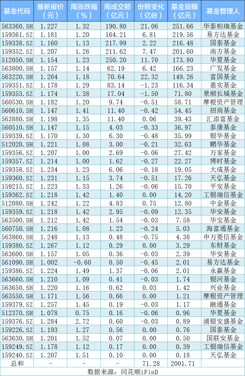 本周五,易方达基金管理的A500增强ETF易方达(563600.SH)上市,中证A500基金来到40只,其中本周39只上涨,仅A500增强ETF易方达下跌。此外,基金总规模再上2000亿元,规模前三为华泰柏瑞、易方达、国泰,分别为251.66 亿元、219.56亿元、216.48亿元。