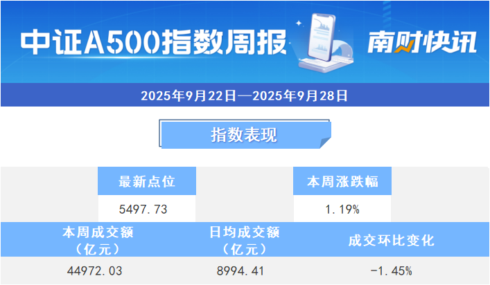 2025年9月23日,是中证A500指数(000510.CSI)正式发布一周年。本周中证A500指数上涨1.19%,截至9月26日收盘,报5497.73点。本周日均平均成交额为8994.41亿元,单日成交额环比下降1.45%。