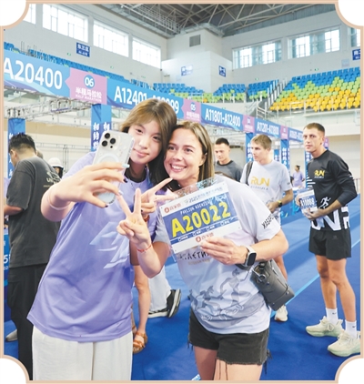 2025鹤岗森林半程马拉松赛开赛前,俄罗斯跑者与中方工作人员合影留念。